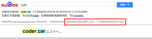 例如搜索『codercar.com』出来的百度快照截图,请注意红框部分的描述。