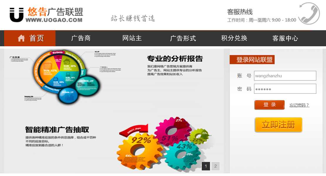 悠告广告联盟-国内信誉最好的日付广告联盟吸取了国内外先进的网络广告管理、投放经验,系统集成了强大的网络广告投放功能,是一个先进的支持多广告主、多网站主的网络广告发布平台。联盟截图: