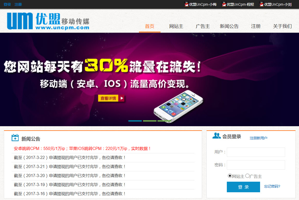 uncpm移动广告联盟-是国内首家移动广告、智能手机cpm广告平台,安卓/ios,安卓流量收购与出售,为广告主提供精准的产品效果营销和品牌推广服务。联盟截图:
