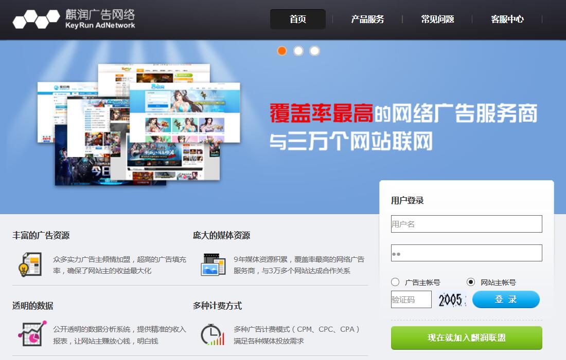 麒润广告网络为珠海麒润网络科技有限公司旗下网站。运营至今与数千个网站媒体建立合作关系,每天广告请求量达9000万次。联盟截图: