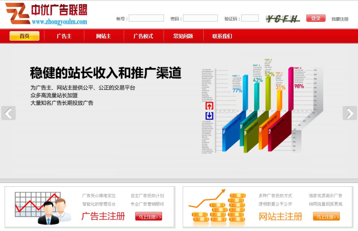 中优广告联盟一直坚持信誉第一,诚信为本,专注于网络营销,提供各类高单价CPA、CPM、CPC等广告,站长投放广告的最佳平台.大量高价CPA聊天室广告,满30日付。中优广告联盟是一家专注于互联网广告及网络营销领域的互联网营销公司,有着非常丰富的网络广告和网络策划经验,专注于网络广告的研究与发展,为客户提供各种形式的网络广告投放服务。其对垂直行业门户站点及娱乐性、交友性等网站也有着丰富的运营经验。 中优广告联盟目前自身站点alexa排名在1000名左右,每天的广告显示量达到8000万次。通过 中优广告联盟全体的努力,在国内网络广告领域已经享有良好的声誉以及品牌。 中优广告联盟将本着“用专业的心,做专业的事”的工作原则,在良好的管理体系下,始终坚持“质优价廉”的产品价格体系,为客户真正做到省心,省钱。