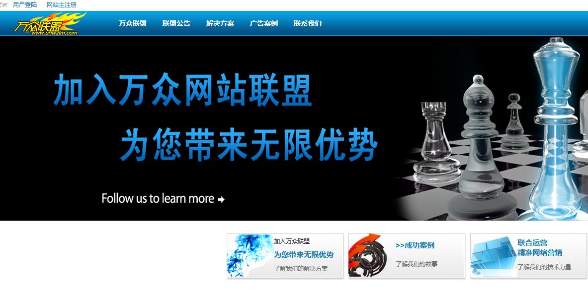 万众联盟是广大网站之间进行合作的一个开放性平台,加入万众联盟,合作网站就可以通过最为简便的形式把自己的流量转变成现金收入!联盟截图: