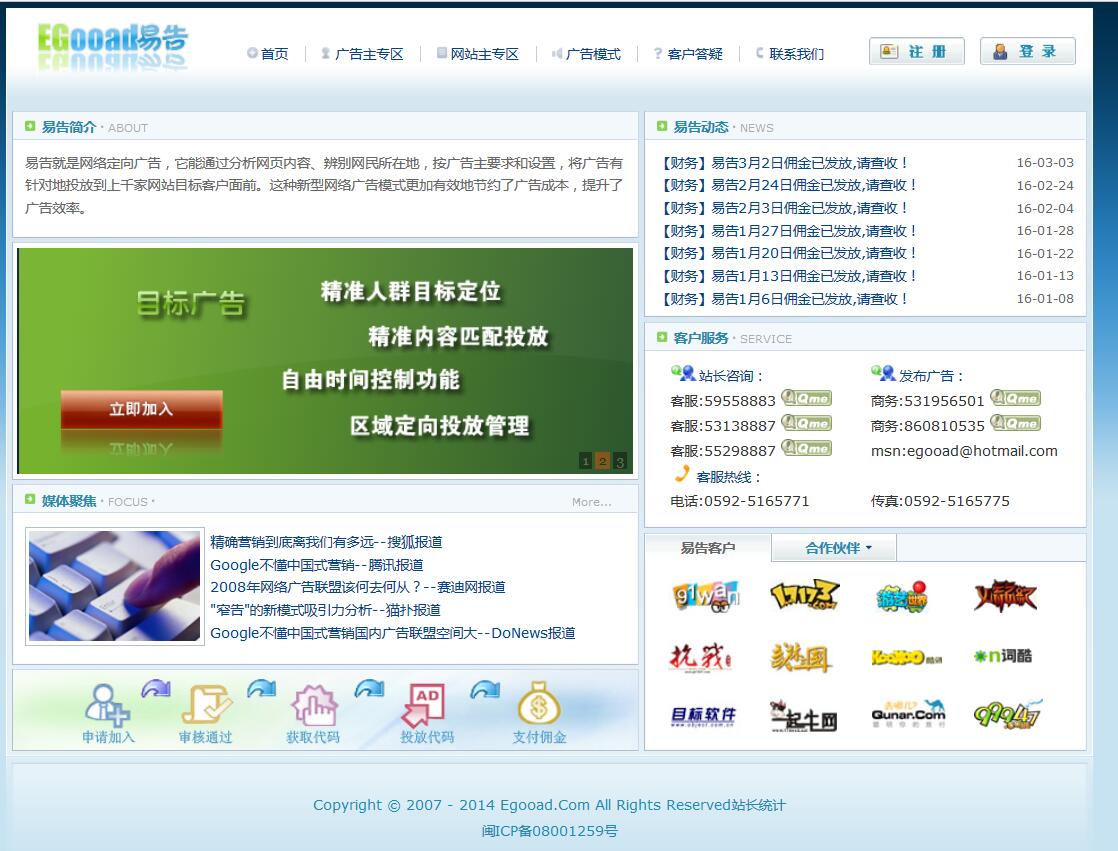 易告广告联盟付款及时,信誉至上。全新模式,高价广告,欢迎投放!易告广告联盟就是网络定向广告,它能通过分析网页内容、辨别网民所在地,按广告主要求和设置,将广告有针对地投放到上千家网站目标客户面前。这种新型网络广告模式更加有效地节约了广告成本,提升了广告效率。