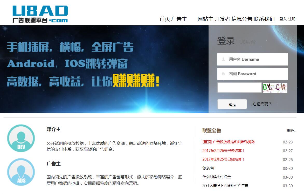 U8广告联盟是一家专注于互联网广告及网络营销领域的互联网营销服务平台,有着非常丰富的网络广告和网络策划经验,专注于网络广告的研究与发展,为客户提供各种形式的网络广告投放服务。其对垂直行业门户站点及娱乐性、交友性等网站也有着丰富的运营经验。联盟截图: