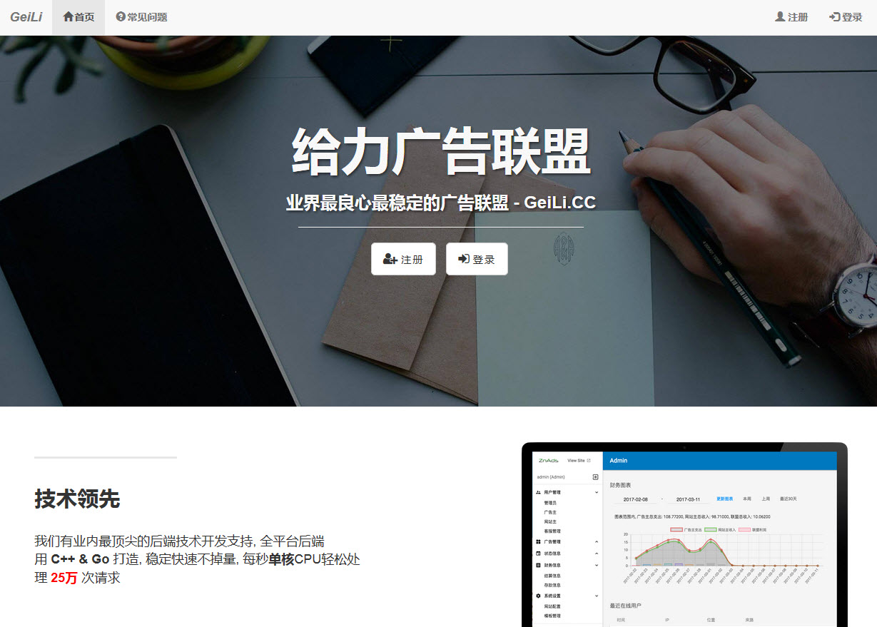给力广告联盟有业内最顶尖的后端技术开发支持, 全平台后端用 C++ & Go 打造, 稳定快速不掉量, 每秒单核CPU轻松处理 25万 次请求联盟截图: