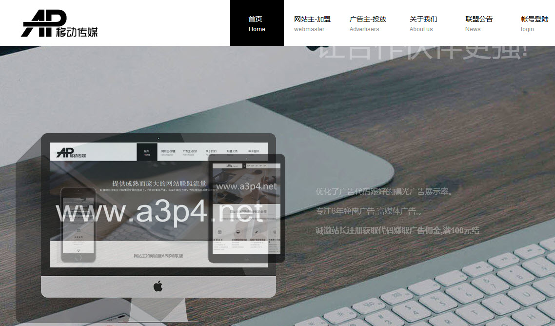 AP广告联盟是一家专注于互联网广告及网络营销领域的互联网营销公司,有着非常丰富的网络广告和网络策划经验,专注于网络广告的研究与发展,为客户提供各种形式的网络广告投放服务。联盟截图: