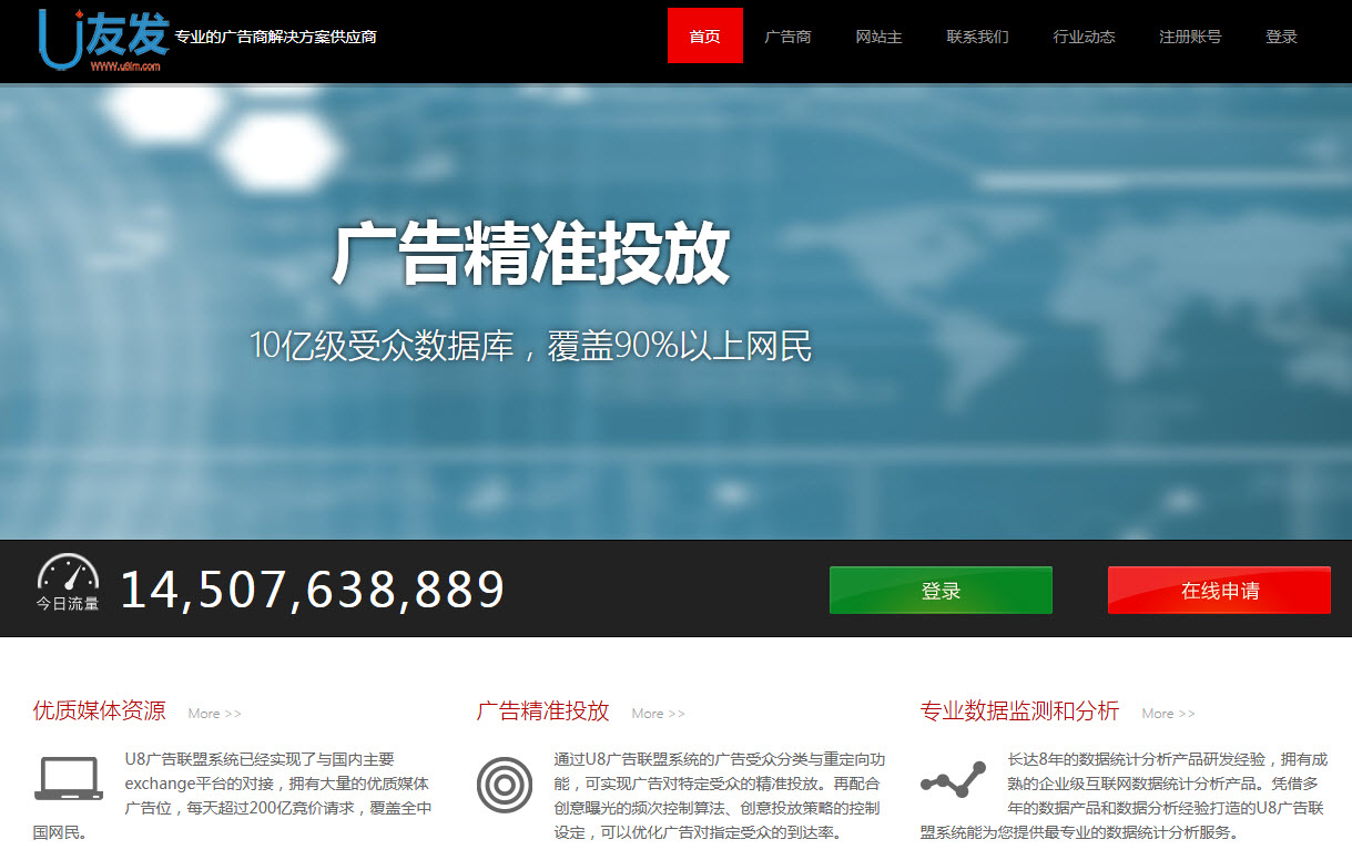 U8广告联盟成立于2017年,注册资金200万,是一家专业的广告推广营销平台。公司主要服务于有关网络广告推广的需求者及网站推广人,提供广告策划,广告推广执行监测,网络推广营销于一体的专业服务。公司以“专注平台,用心服务”为核心价值,希望通过我们的专业水平和不懈努力,塑造一个良好的网络形象,为企业产品推广,文化建设传播提供服务。联盟截图: