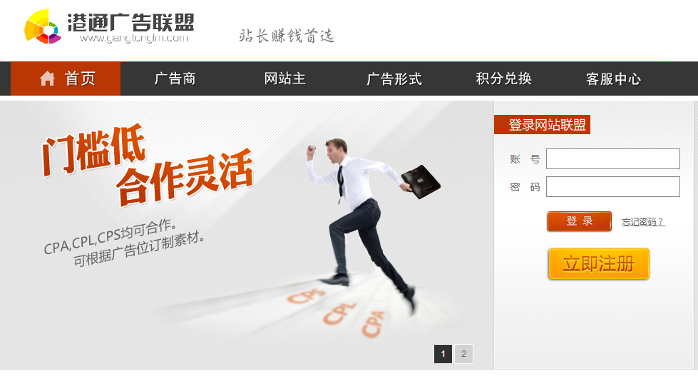 港通广告联盟是专为站长和广告商精心打造的网赚平台!佣金高,结算快.专业提供网络广告、弹窗广告、点击广告、CPM、CPV、CPS、CPA广告.联盟截图: